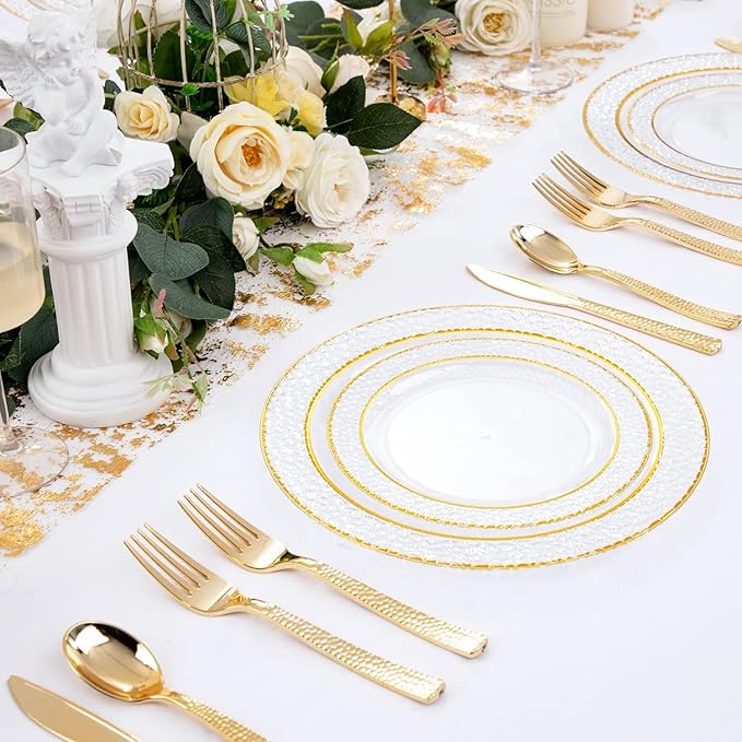 - Elegant Design: The attractive 300 piece gold hammered plastic place appearance makes it ideal for elegant dining environments such as weddings, parties, and catered events! Gold Plastic Place Setting has a unique ,refined look and design that makes it even more appealing than real silverware.