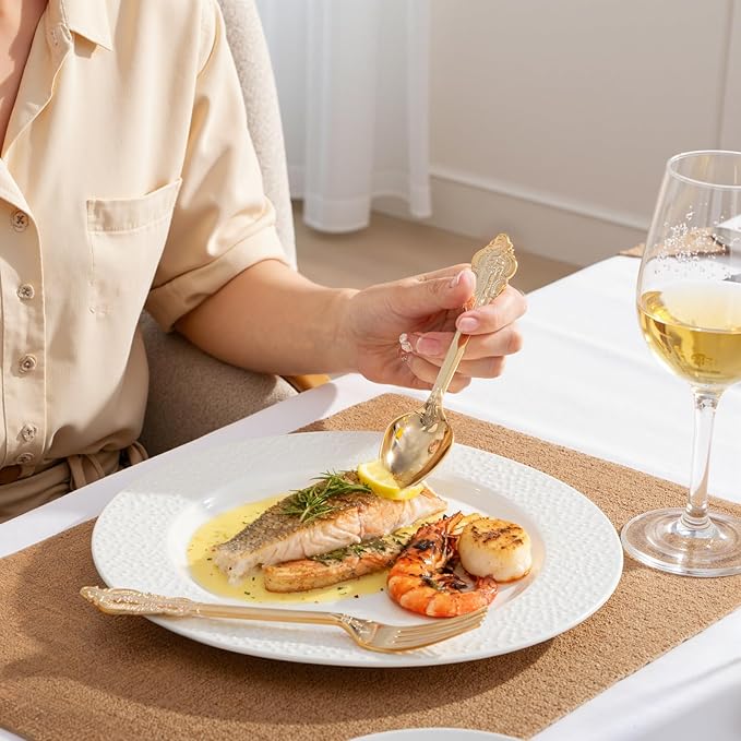 - PREMIUM QUALITY: 100% food grade, non-toxic, BPA-free plastic! Those gold plastic silverware are safe you and your guests. Solid, durable, heavy duty cutlery ensure won't scratch or break easily.