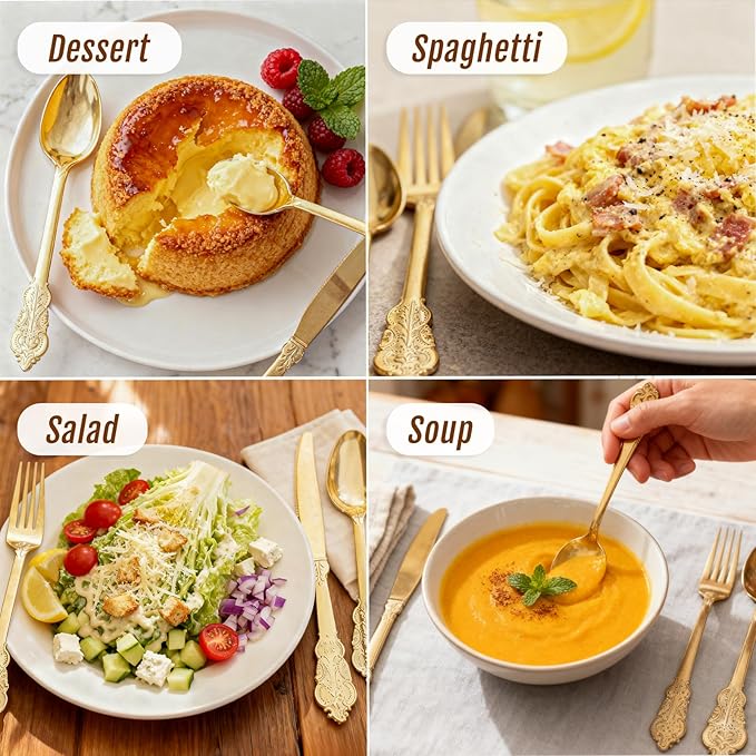 - CONVENIENT TO USE - When the party is over, you can spend more time with family and less time cleaning dirty gold disposable cutlery. Keep them and reuse it. So convenient and release your hands.
