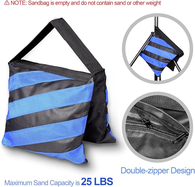 - 【Photography Weight Sandbag】: Premium quality nylon, blue and black stripe, more conspicuous and stabilize photo support equipment. (NOTE: this bag comes empty, please filled with gravel, or any other material to add weight and the maximum capacity is 25 LB.)