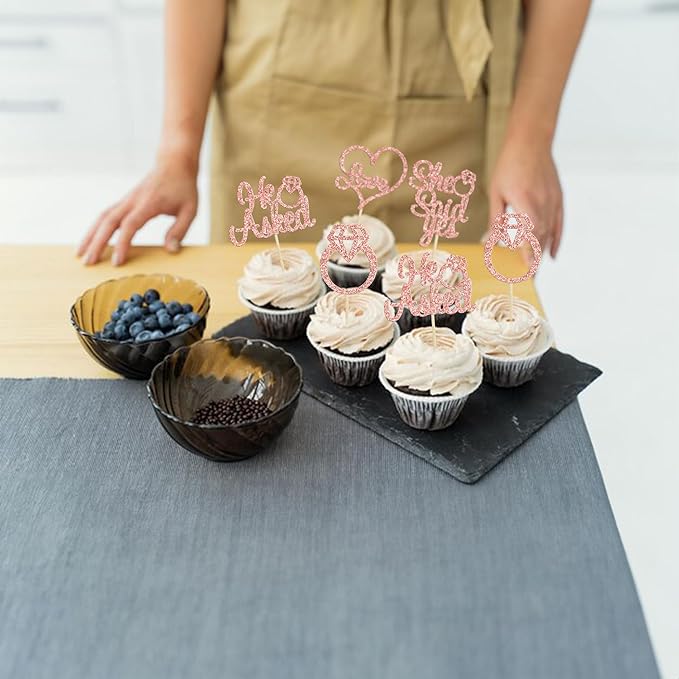 - 🧡Premium Material: This glitter He Asked She Said Yes cupcake toppers are made of high quality paper and food-grade toothpick, very safe to put them on cakes, cupcakes, ice cream, fruits, pie, dessert, cheese or any dish and food appetizer you want to decorate.