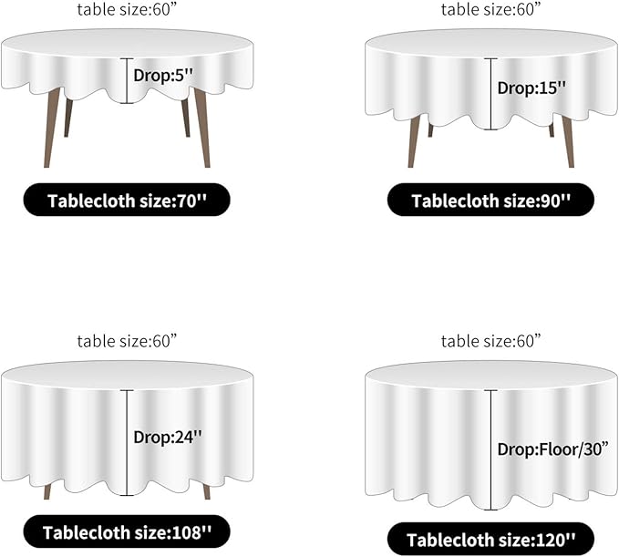 - 2 PACK SET, MORE ECONOMICAL: Each pack include 2 pcs of tablecloth, measuring 120” diameter each. Durable for repeat use, cheaper than renting.We also have 6 pack set and 12 pack set,which will save more.
