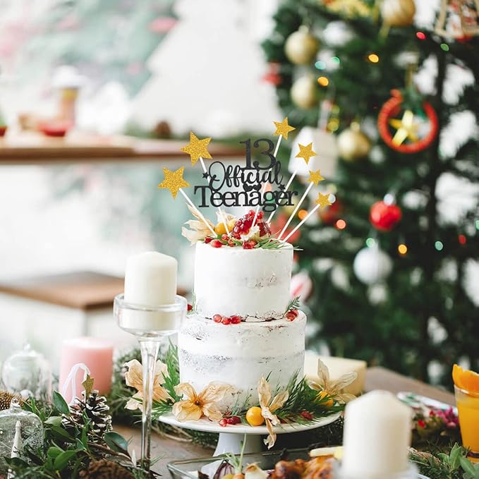 Glittery 13 Ofiicial Teenager Cake Topper with Star,13th Happy Birthday Cake Topper Party Decorations Party Supplies for Boys Girls Black Gold