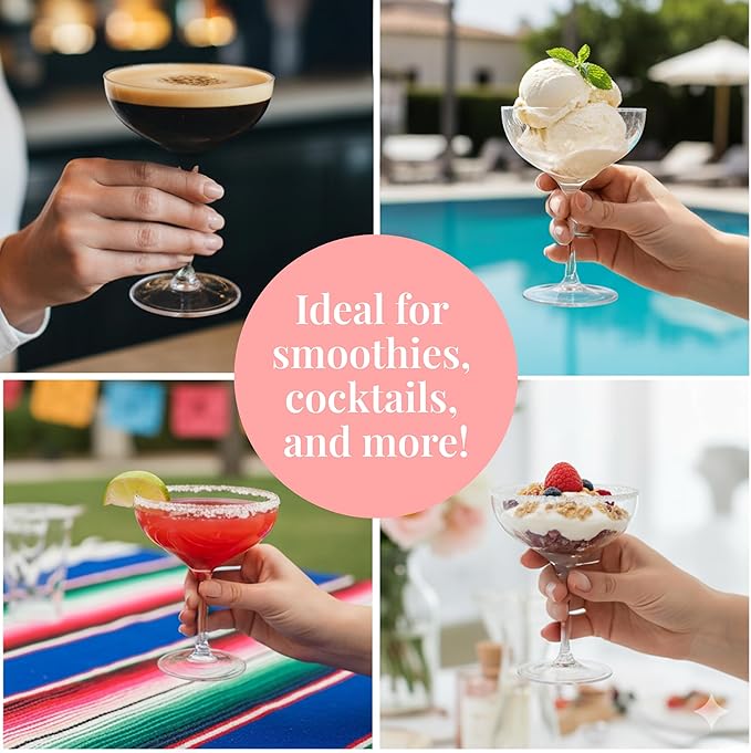 Prestee 24 Clear Plastic Coupe Glasses 4oz - Disposable Plastic Cocktail Cups, Martini Glasses, Margarita Glass, Champagne Glass for Parties, Cinco de Mayo, Taco Party, Weddings Decorations