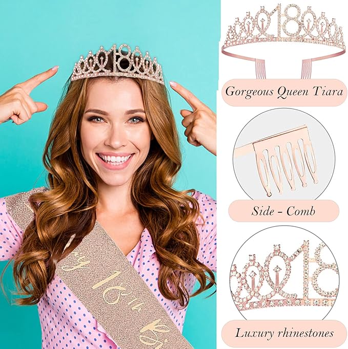 - Glittery Rose Gold Crown 18: Made of high quality alloy and rhinestone. 18th Birthday Tiara is with combs that make sure it can grip the hair more tightly for fitting girls. Dimension: 5.4” on the front side.
