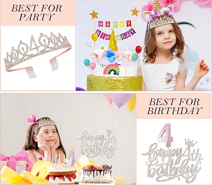 - 4th Birthday Decorations for Girl: Glittery 4th tiara/crown *1pc, “It’s my 4th birthday” sash *1pc, Happy 4th birthday cake topper *1pc, pearl pin*1pc, Number 4 candle *1pc, Number 4 balloon *1pc, they are exquisitely packaged in the carton.