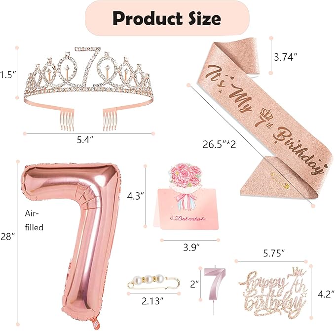 - 7th Birthday Decorations for Girls: Glittery 7th tiara/crown *1pc, “It’s my 7th birthday” sash *1pc, Happy 7th birthday cake topper *1pc, pearl pin*1pc, Number 7 candle *1pc, Number 7 balloon *1pc, they are exquisitely packaged in the carton.