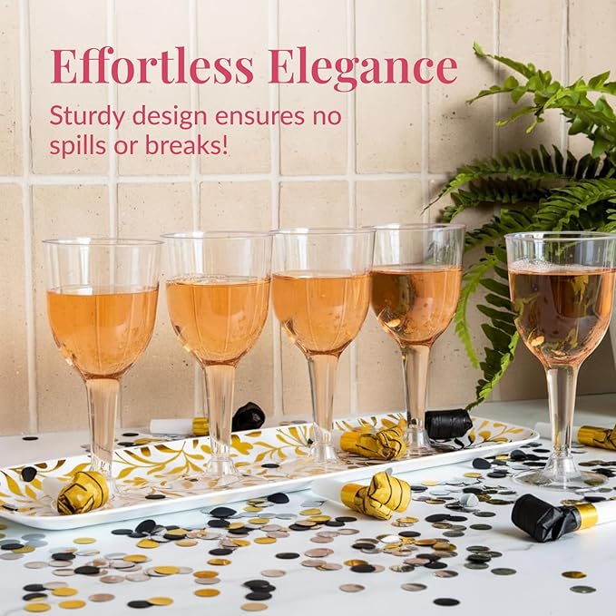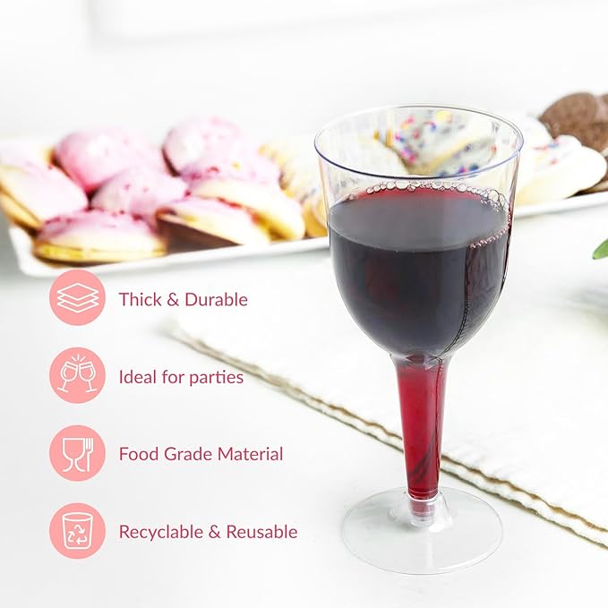 - PARTY WINE GLASSES: Make your celebrations memorable with these plastic wine cups Perfect disposable wine glasses for wedding, picnics, patio gatherings, baby showers, bachelerotte parties, barbeques, family reunions, and everyday use An awesome option if you are looking for plastic wine glasses with stem.