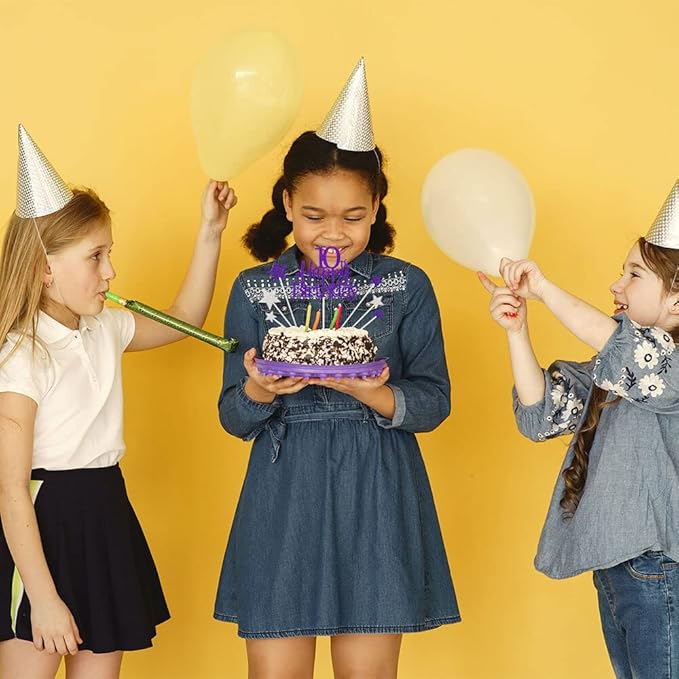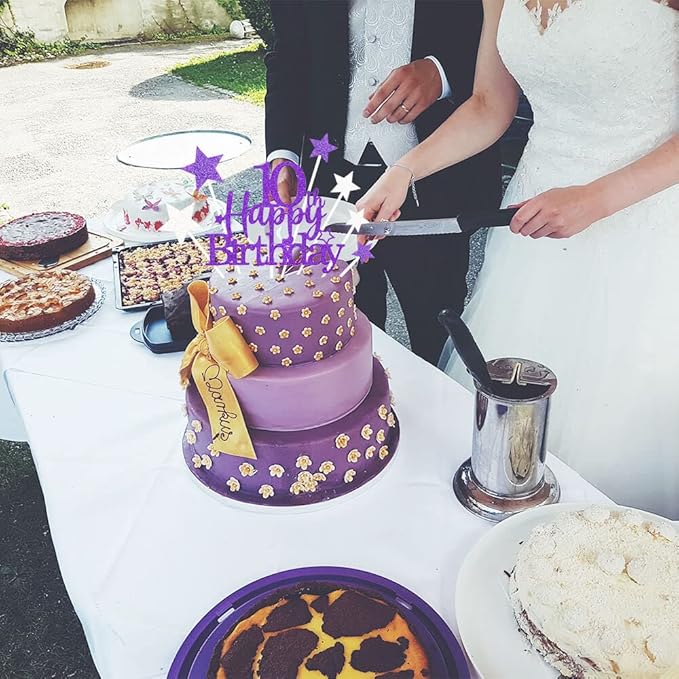 Glittery 10th Happy Birthday Cake Topper with Star,Personalised 10 Birthday Cake Toppers Party Decorations Party Supplies for Boys Girls Purple Silver