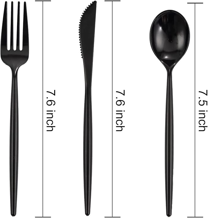- [Durable Plastic Silverware]-Black plastic silverware include 7.6 inch 60 forks,7.6 inch 60 knvies,7.5 inch 60 spoons which are made of strong and durable plastic.