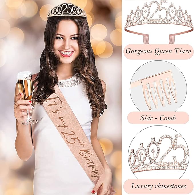 - Glittery Rose Gold Crown 25: Made of high quality alloy and rhinestone. 25th Birthday Tiara is with combs that make sure it can grip the hair more tightly for fitting girls. Dimension: 5.4” on the front side.