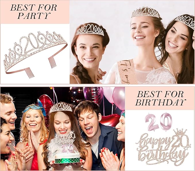 - Glittery Rose Gold Crown 20: Made of high quality alloy and rhinestone. 20th Birthday Tiara is with combs that make sure it can grip the hair more tightly for fitting girls. Dimension: 5.4” on the front side.