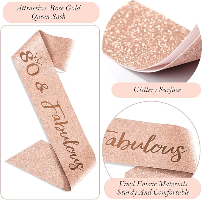 - Birthday Women Girl Sash: Our 80th birthday sash is made of high quality glitter fabric with foil “80 & Fabulous” lettering . The sash is in 61 inch length and comes with a gold charm pin that you can easily adjust the length you need.