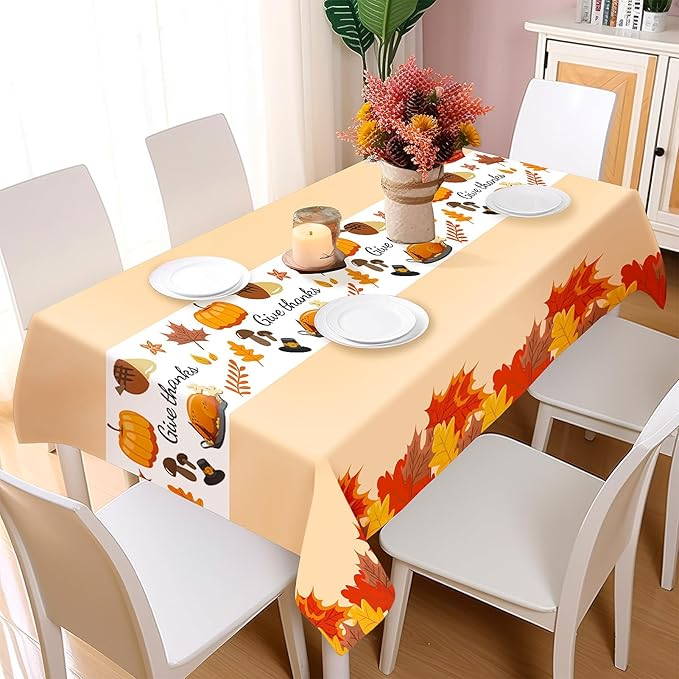 - Thanksgiving Decorations Includes: 3Pcs Thanksgiving themed plastic tablecloth, great for thanksgiving decorations, thanksgiving table decorations, thanksgiving party decorations. The party supplies with pumpkin, maple leaf and other fall pattern , which is a great way to show the spirit of harvest and thankful during Thanksgiving party gathering. The bright color and classic pattern will light up your party, caught everyone's eyes