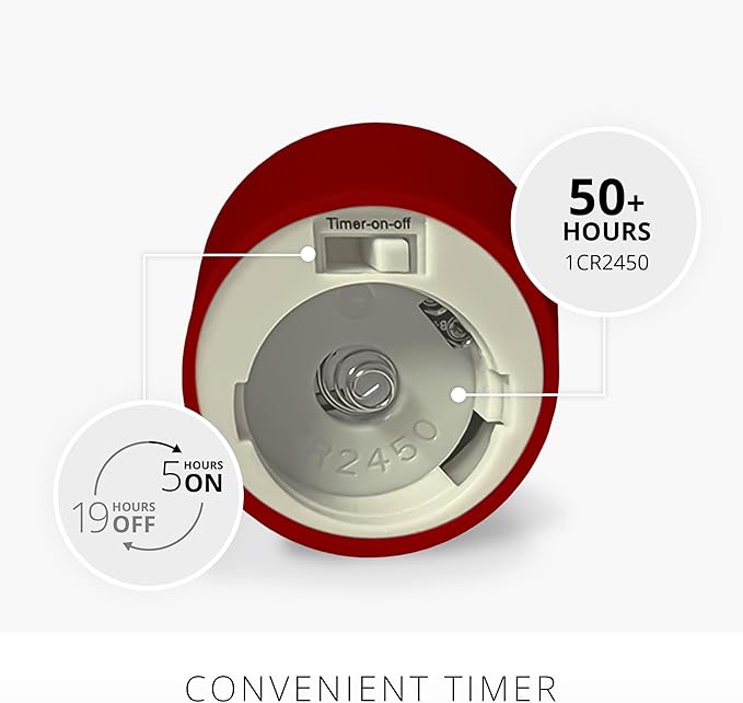 - Each candle uses 1 CR2450 button battery, which will give you 50 hours total runtime before needing to be replaced. When used with the automatic timer, you'll only have to replace the batteries a few times during the whole holiday season, from Halloween to New Year's. That makes these votive candles a beautiful decorating choice that is easy on the wallet for long-term use.