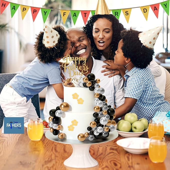 - Package includes: 32 pcs balls cake decorations with different colors and sizes. They are gold, black, silver colors as picture showed. Silver and black are 8, and the remaining 16 are gold.