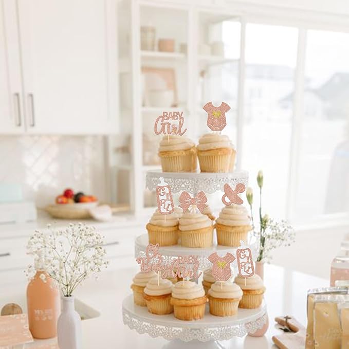 24 Pack It's a Girl Cupcake Toppers Glitter Pacifier Onesie Jumpsuit Bow Gender Reveal Cupcake Picks Welcome Baby Shower Cake Decorations for Baby Girl Birthday Theme Party Supplies Rose Gold