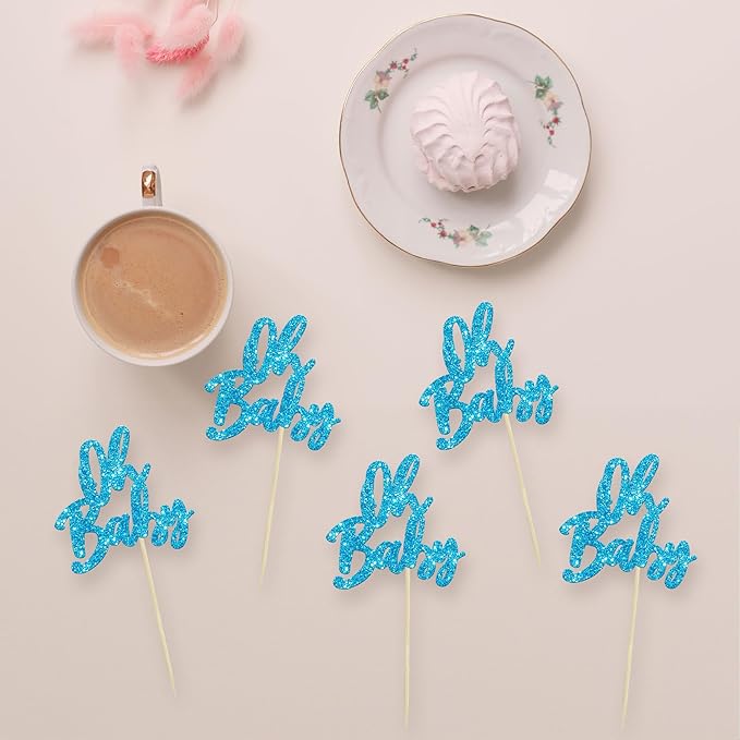 24Pcs Oh Baby Cupcake Toppers Glitter Baby Shower Cupcake Picks Gender Reveal Theme Cake Decorations for Baby Shower Kids Boys Girls Birthday Party Supplies Blue