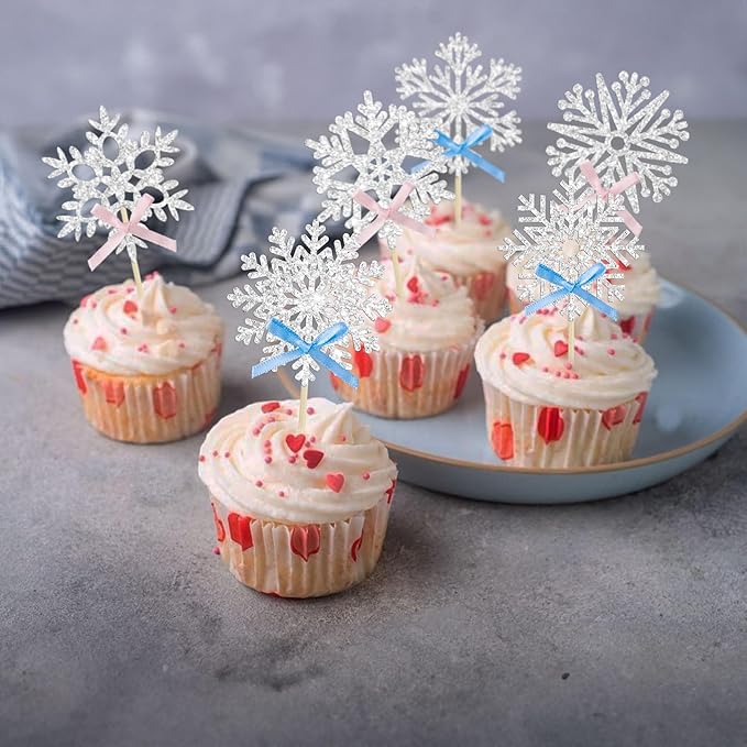 24Pcs Snowflake Cupcake Toppers Silver Glitter Pink Blue Bow Snowflake Gender Reveal Cake Toppers Decorations for Baby Shower Winter Wonderland Christmas Party Supplies