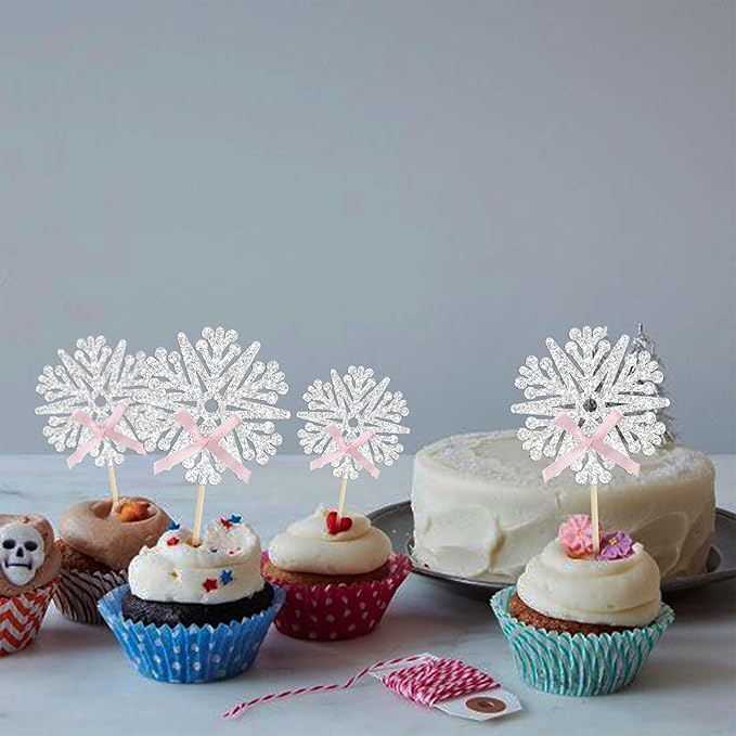24Pcs Snowflake Cupcake Toppers Glitter Snowflake Cupcake Picks Frozen Pink Bow Snowflake Gender Reveal Cake Decors Baby Shower Gender Reveal Winter Theme Christmas Party Cake Decor Supplies