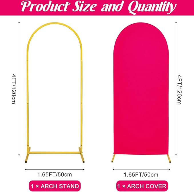 Metal Arch Stand and Cover Set,1 Fushia Spandex Fitted Backdrop with 1 Gold Wedding Arched Stand Frame for Parties Birthday Baby Shower Bridal Banquet Decoration (4FT)