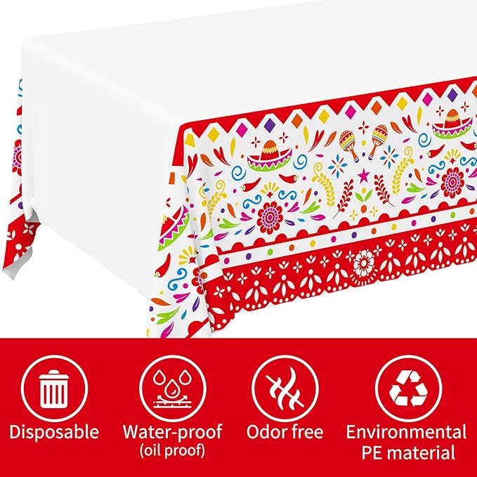 - Complete Fiesta Celebration Kit: Elevate your celebration with our complete fiesta celebration kit, featuring 2 elegantly styled 54 x 108 inch disposable plastic tablecloths. Designed for both function and flair, these tablecloths are a must-have for any fiesta party decorations, ensuring your Mexican party is both vibrant and hassle-free.