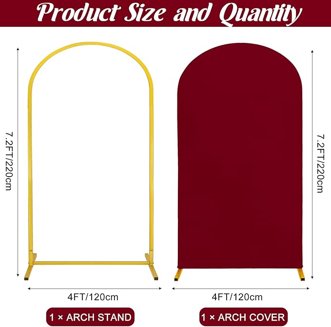 Metal Arch Stand and Cover Set,1 Burgundy Spandex Fitted Backdrop with 1 Gold Wedding Arched Stand Frame for Parties Birthday Baby Shower Bridal Banquet Decoration (7.2FT)