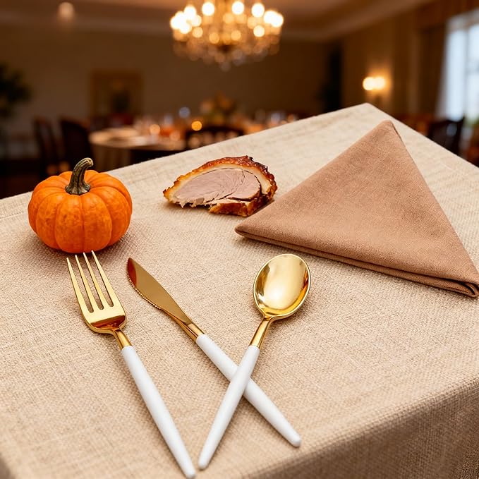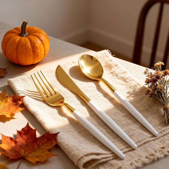 - 【ELEGANT WHITE GOLD DESIGN】Featuring an elegant white and gold combination, our gold silverware disposable adds a touch of class to any occasion. The gold finish elevates this plastic cutlery set above others, making it a perfect choice for birthdays, weddings, or baby showers. It effortlessly enhances the overall décor and creates a visually appealing table setting.