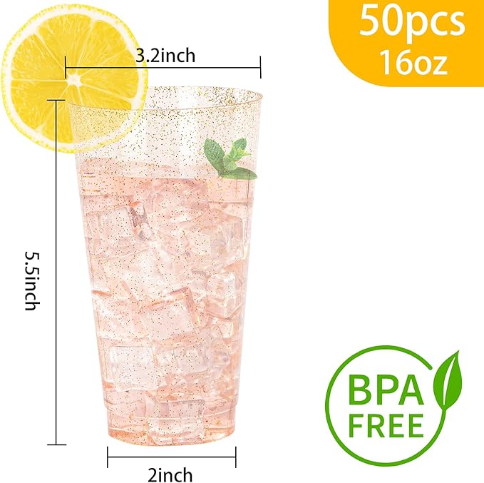 - Health and Durability: The materials of these 16 oz gold glitter cups are BPA-free and no-toxic. Our 16 oz plastic cups are made of heavy duty and durable plastic to ensure these plastic cups will not easily broken or scratched.