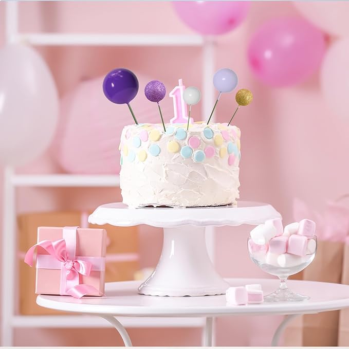 - Package includes: 50 pcs cake balls decorations with different colors and Sizes. They are dark purle, light purple, glitter purple, white, glitter gold colors as shown in the picture.