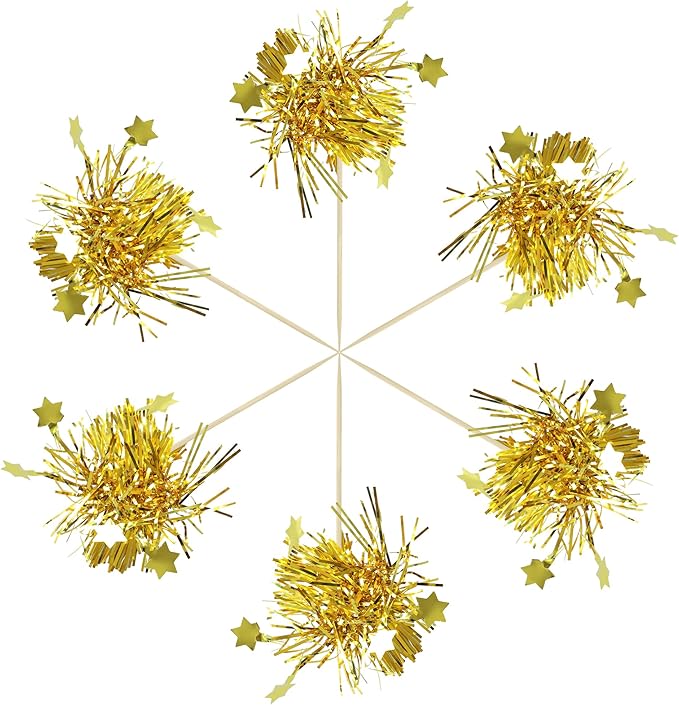 Gyufise 30Pcs Star Foil Firework Cupcake Toppers Sparkle Tinsel Cake Toppers Tinsel Drink Cake Decoration Cocktail Picks for Birthday Wedding Graduation Party Supplies Gold