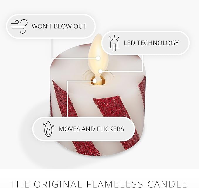 - These wax tealights feature red glitter and white stripes, adding a joyful, peppermint accent with genuine moving-flame technology to your favorite holiday decorations.