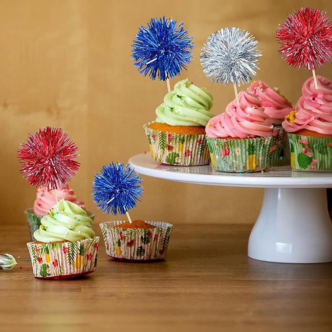 Gyufise 30Pcs Foil Firework Cupcake Toppers Sparkle Tinsel Cake Toppers Tinsel Drink Cake Decoration Cocktail Picks for Birthday Wedding Graduation Party Supplies Silver Dark Blue Red
