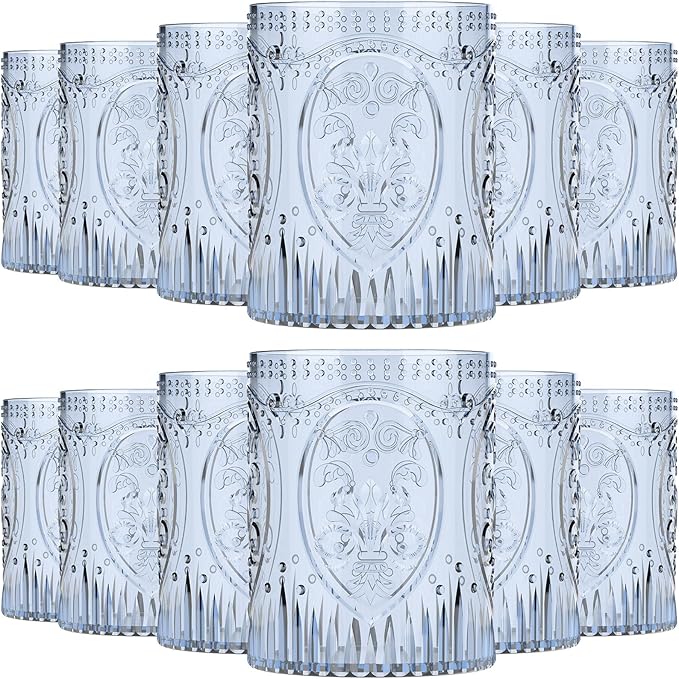 12 Plastic Vintage Drinking Glasses 8.5oz Stemless Retro Embossed Wine Glasses Shatterproof Reusable Cups for Baby Shower Wedding Reception Grand Event Party (Blue)