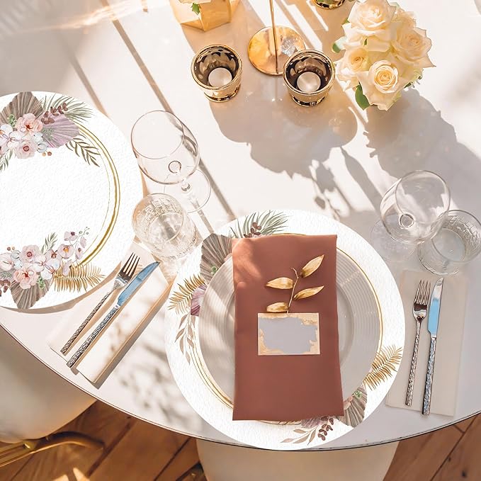 50 Pack Paper Placemats Disposable Boho Floral Leaves Place Mats 13.7 Inch Bohemian Round Table Mats for Birthday Spring Wedding Bridal Baby Shower Party Supplies