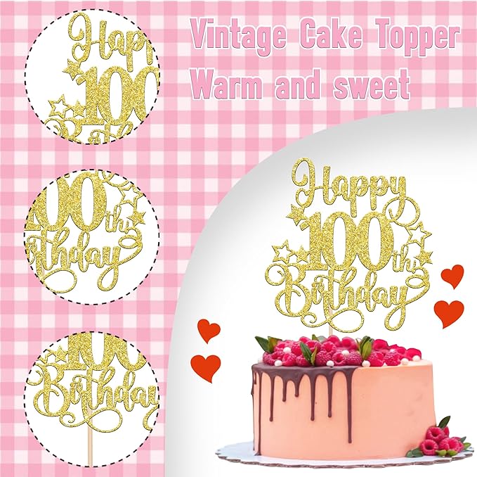 - Wide Usages ! The cake topper is perfect for happy 100th birthday theme party, cheers to 100 years theme party, 100 fabulous theme party, happy 100th birthday anniversary theme party cake decorations, they can make your cake more attractive and bring the fun to your party.You can also apply them for ice cream, fruits, cookies and other desserts.