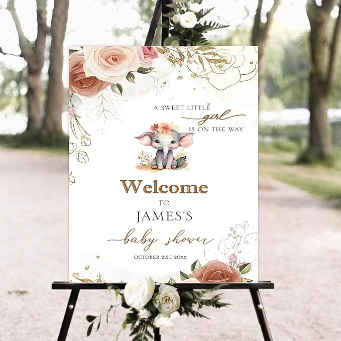 Personalized Baby Shower Sign, Floral, Elephant & Woodland Animals, Full Size, Plastic, Cottage Style