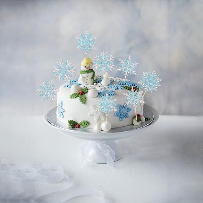 - High Quality:Snowflake decorations are made of glittery cardboard and toothpick, which is non-toxic and safe to food, durable and sturdy. It is glossy on the front and has a white back.