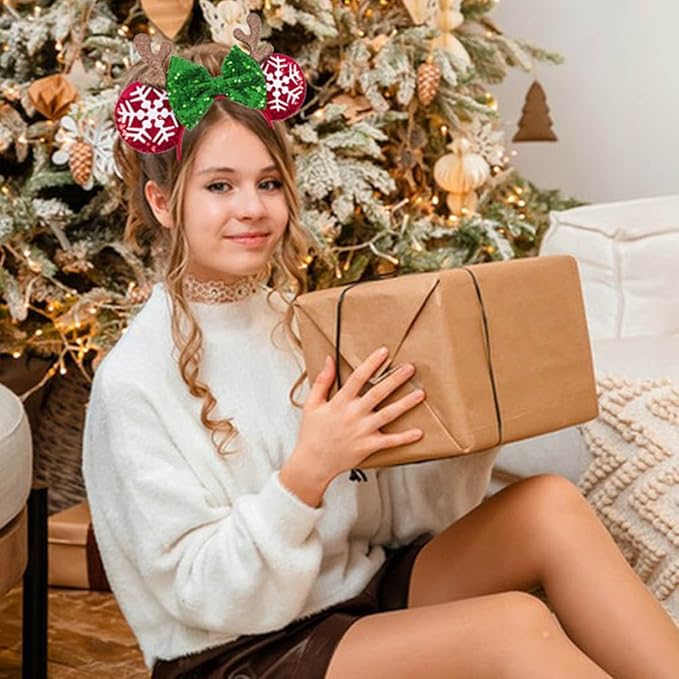 - 🦌Unique Design - This princess headband features Mouse's ears, a green bow, elk antler snowflake and beautiful green and red sequins together to create a stunning hair accessory. Double sided design, one side have pattern, and the other side not. They will lend a girly touch to any outfit.
