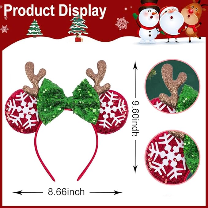 1 Pack Christmas Snowflake Headbands Mouse Ears Hairband Elk Antler Hair Hoop Green Red Glitter Sequins Bow Headband Hair Ornament for Christmas Cosplay Princess Dress Up Party Hair Accessories
