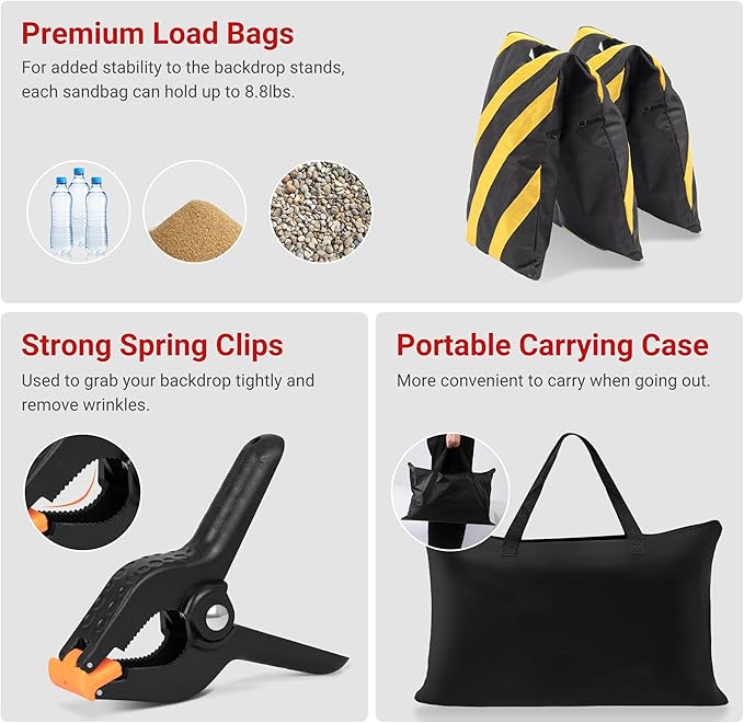 - [Sturdy Base Tripod Bracket] The tripod backdrop stand provides stability for the background stand. The two included stand bags used to place on the tripod base will further enhance the stability and firmness of the overall structure.