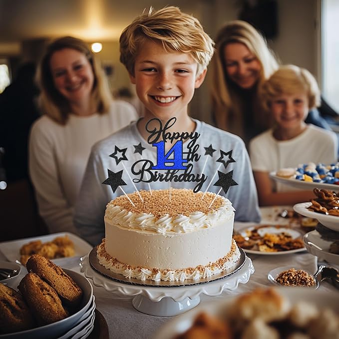 - 【Premium Quality Glitter Cake Decorations】The "Happy 14th Birthday" cake topper will be shiny under the light. The cake topper includes a smooth, food-grade plastic support stick, it's waterproof and reusable. It is protected by cardboard and can effectively avoid the product being damaged, give you nice using experience.