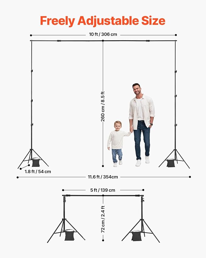 - Adjustable Size: Our adjustable backdrop stand supports backdrops up to 8.5 x 10 ft / 260 x 300 cm. The height of support poles can extend from 2.4 ft / 72 cm to 8.5 ft / 260 cm, and the width can extend from 5 ft / 139 cm to 10 ft / 306 cm to fit different backdrop sizes. Note: This product does not include balloons, decorative items, or backdrop fabric.
