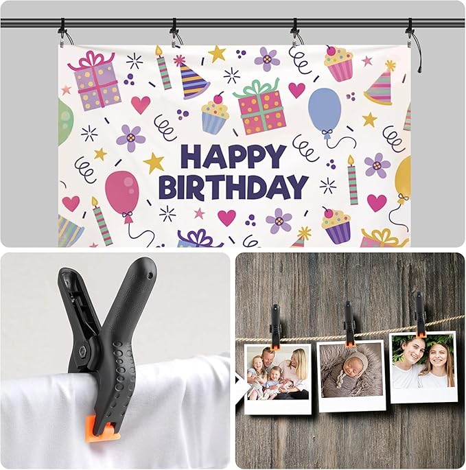 - 【6 X BACKDROP CLIPS】: The backdrop clip is made of quality elastic nylon, which is durable and strong. Length of the bottom clips is 34 cm, which can fit most kinds of crossbars and bottom stand, a rope is attached to the back of the clip, and there is a button on the rope that you can use to control the length of the rope
