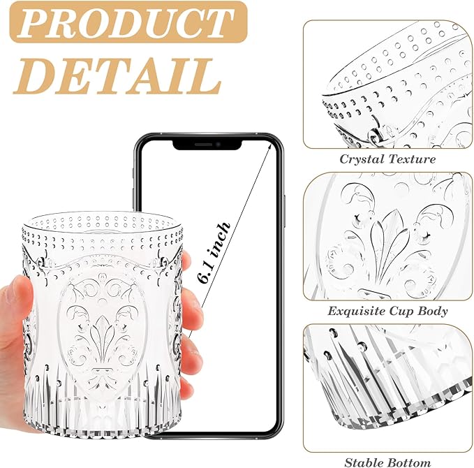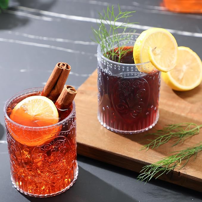 - Quality Material: the embossed drinking glasses are made of plastic material offer the beauty of glass without the risk of breakage. They're sturdy, lightweight, and safe for daily use and party event, suitable for both indoor dinners and outdoor celebrations. (Not recommended for hot water)