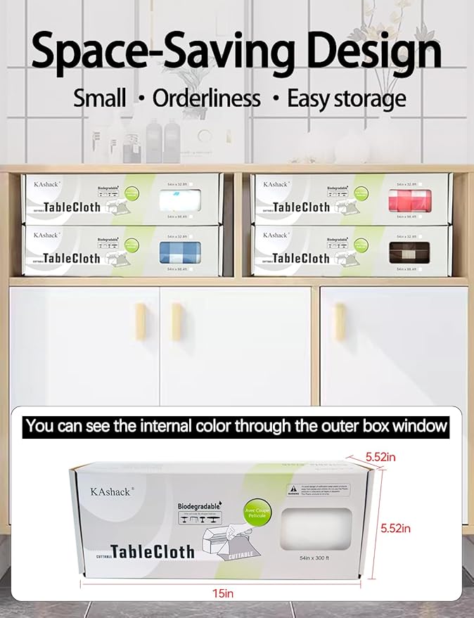 - 【Slide cutter to choose your size】The 54 inch x 300 ft black plastic table cloth disposable roll can be cut to size and fitted for rectangle, square, round, or oval tables. Customize the perfect fitting tablecloth for any table.The table cloth is neatly rolled up in a handy box,You can see the internal color through the outer box window.