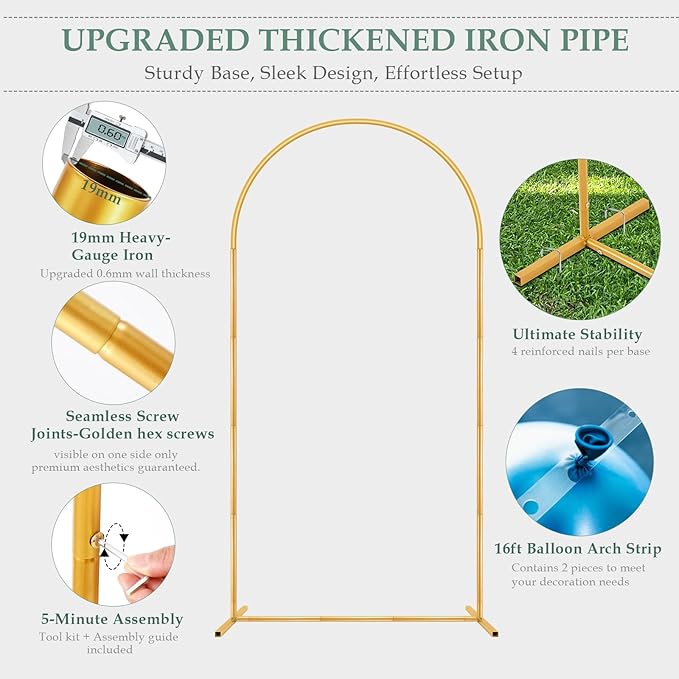 - METAL TUBES FOR SUPERIOR DURABILITY: Our balloon arch stand features heavy-duty 19mm diameter iron tubes (thicker than competitors' 15mm), with a 0.6mm wall thickness for unmatched strength. Paired with high-saturation, fade-resistant paint, this metal arch stand resists bending and chipping, ensuring a long-lasting backdrop for any event.
