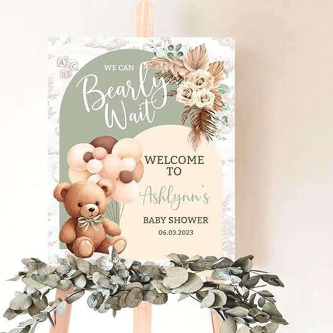 Green Bear Balloon Baby Shower Sign, We Can Bearly Wait Baby Shower Welcome Sign, Boho Bearly Wait Cute Decor Sign #7