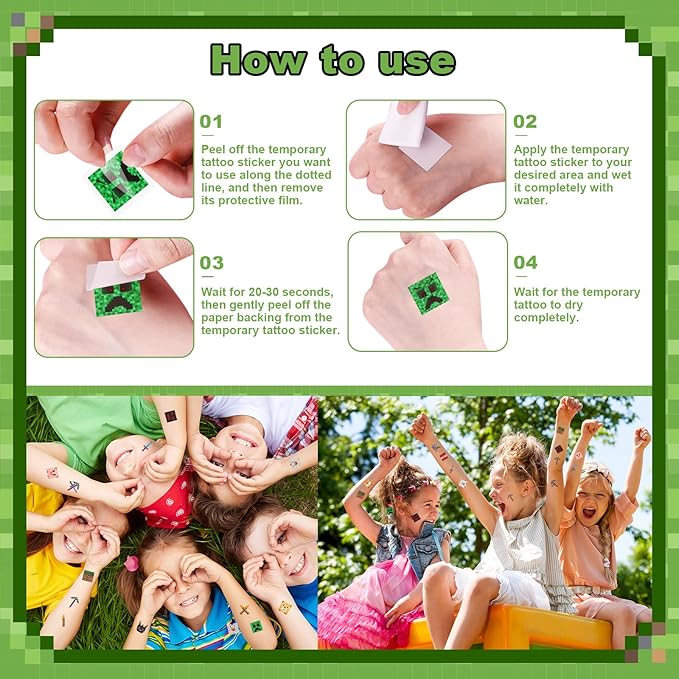 - Bonus 54 Fun Temporary Tattoos (3 Packs × 18 Pcs Each: Comes with 3 packs of temporary tattoos,These are easy to apply and remove. They perfectly complement the party atmosphere, allowing guests to decorate themselves and enhancing interaction and fun during the event—ideal for game-themed parties, birthdays, or gatherings.