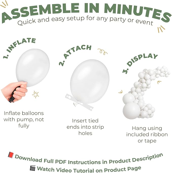 - 🛠️ Easy DIY Setup in Minutes. Create your balloon garland or arch quickly and easily with the included 16 ft balloon strip and a roll of glue dots. No special skills or tools needed—just inflate and decorate!